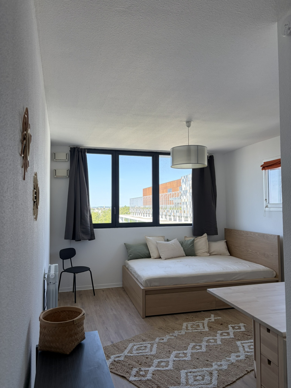 Appartement meublé rénové de type une pièce d'environ 23.79 m² au 6ème et dernier étage dans une résidence étudiante avec ascenseur comprenant une entrée avec placard, une pièce de vie, une table, une cuisine équipée et aménagée (plaque vitrocéramique, une hotte, un mico onde, ustensiles de cuisine), une salle d'eau avec wc.