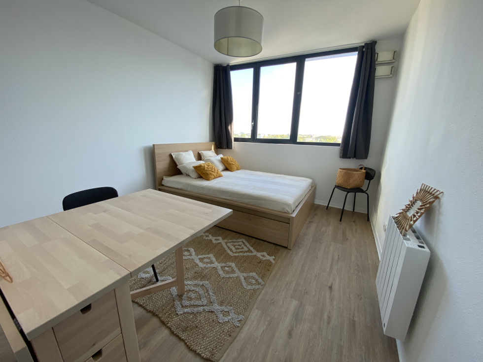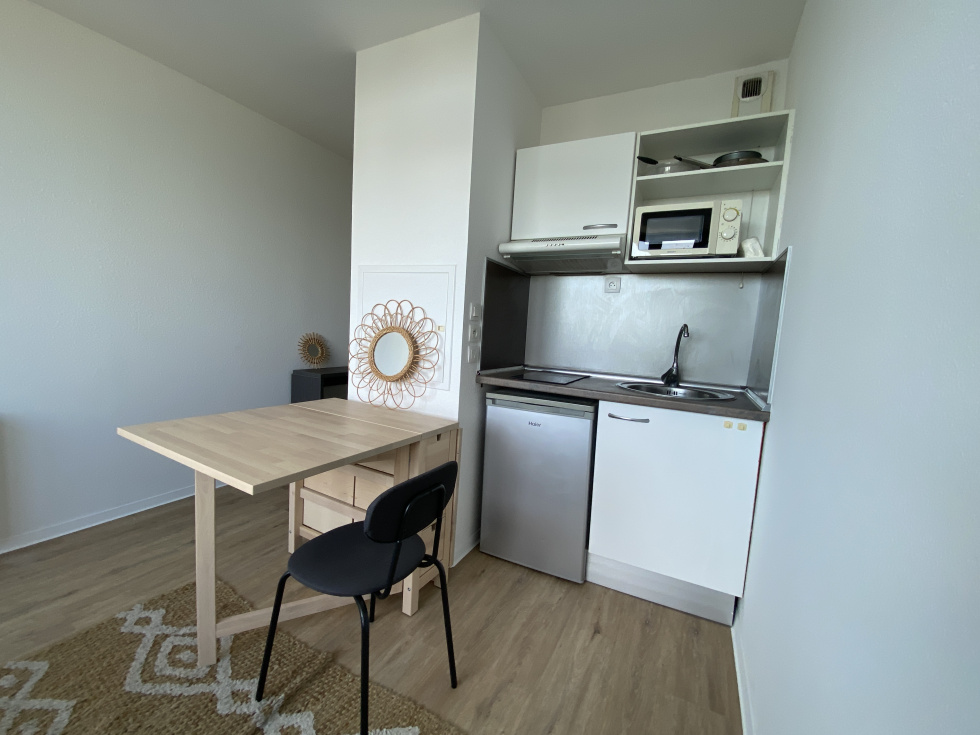 LIBRE DE SUITE A DEUX PAS DE L'ECOLE DE COMMERCE KEDGE - Appartement meublé rénové de type une pièce de 20,43 m² au 6ème et dernier étage dans une résidence étudiante avec ascenseur comprenant une entrée avec placard, une piéce de vie avec lit coffre double, une table, une cuisine équipée et aménagée (plaque vitrocéramique, une hotte, un mico onde, ustensiles de cuisine), une salle d'eau avec wc.